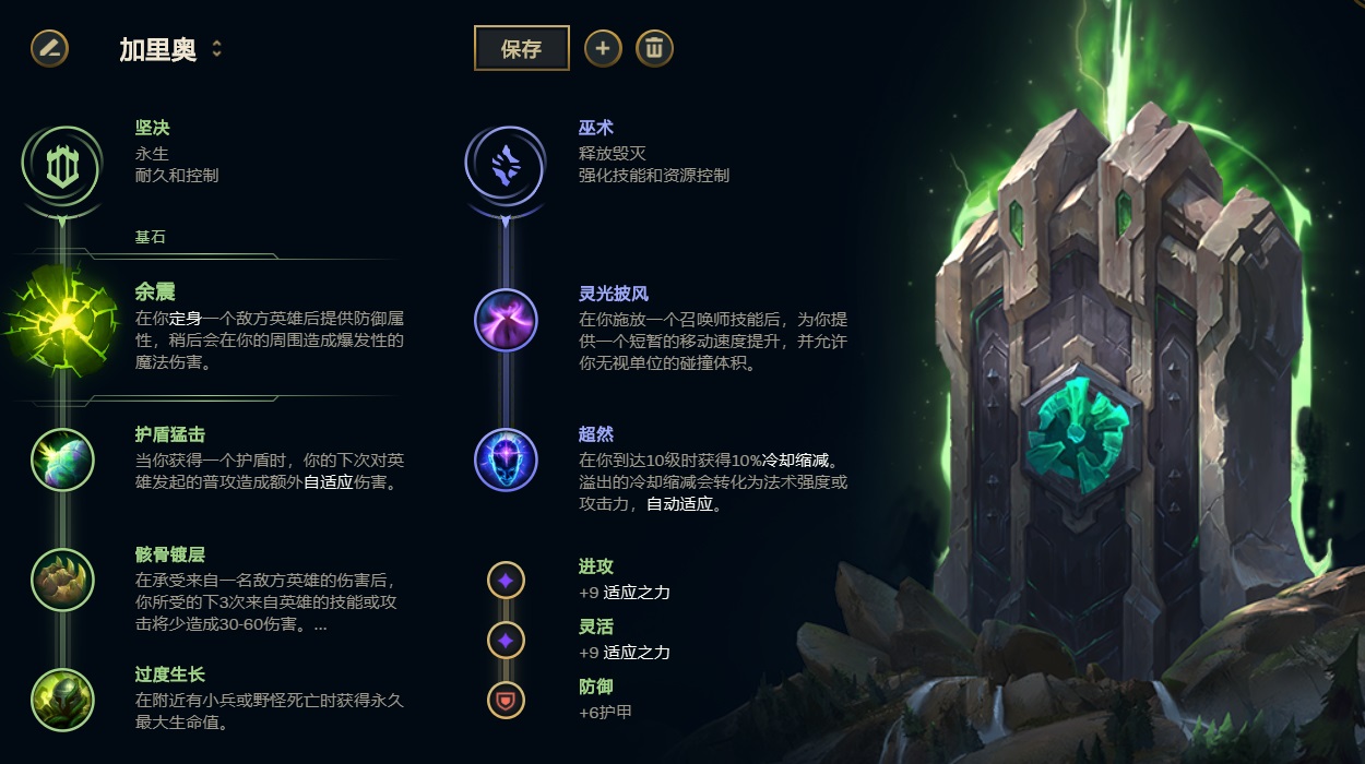 核心符文点出余震提升控制后的抗性,搭配骸骨效果最好,其他两个符文点出护盾猛击(提升护盾抗性和额外伤害)和过度生长(提升成长生命)。