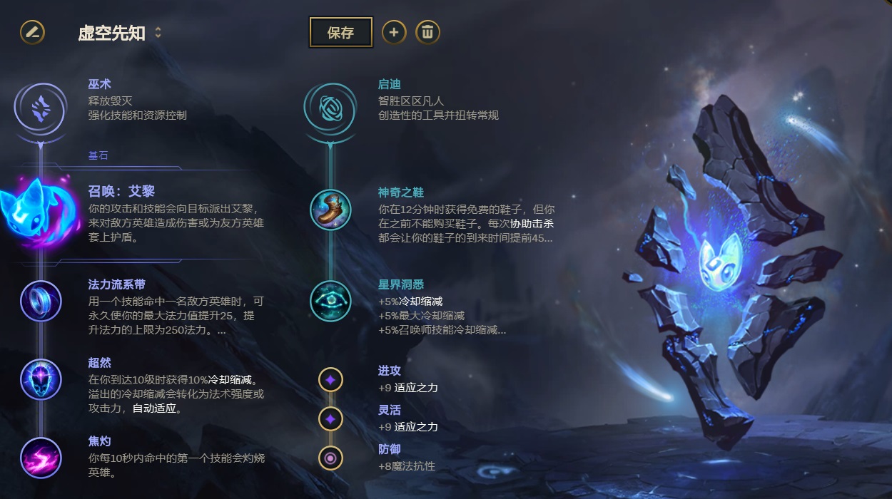 核心基石符文点出艾黎,搭配的是焦灼提升自己的消耗能力,其他的两个符文选择法师的标配流系带和超然。