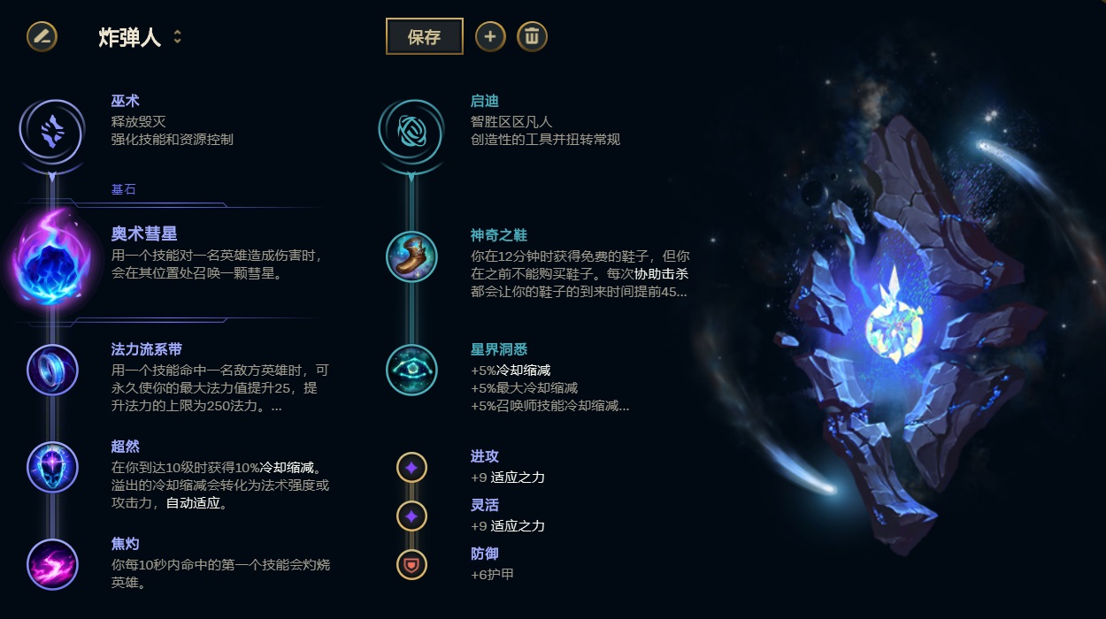 炸弹人的符文点法,核心符文搭配是彗星+焦灼提升消耗能力,流系带提升法力续航,超然减少技能CD,副系则点出神奇之鞋与星界洞悉的组合。