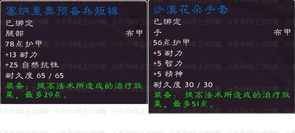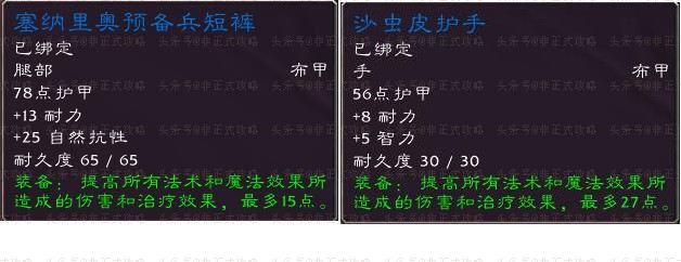 因为这个任务线的最终奖励十分丰厚,有各职业+25自然抗性的护腿,还有一件本职业的蓝色装备,其中包括法师和术士职业+27法伤的手套、牧师+51治疗的手套。对于有需求的小号来说是非常值得一做,特别是P5阶段安其拉神殿开放之后要堆自然抗性的沙包职业,重点提一下,这段时期若打到一些加自然抗性的装备可以留存一下了,或者有时间精力的玩家可以去MLD提前刷下自然抗装备。