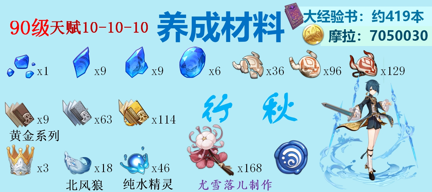 行秋是一名集挂水、输出、抗打断、伤害减免、回血为一体的多功能型四星水系单手剑角色,需要霓裳花、黄金系列天赋书等突破材料。