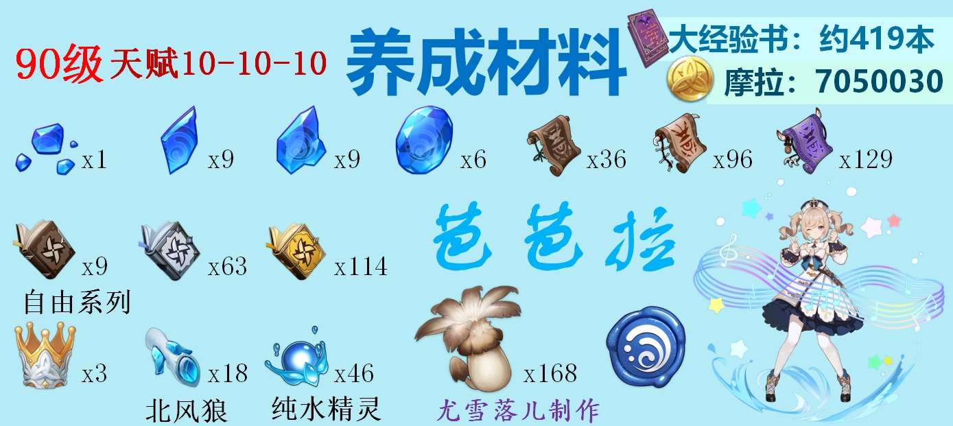 芭芭拉是一名四星奶妈,突破需要慕风蘑菇、自由系列天赋书、禁咒绘卷、纯水之心等材料。