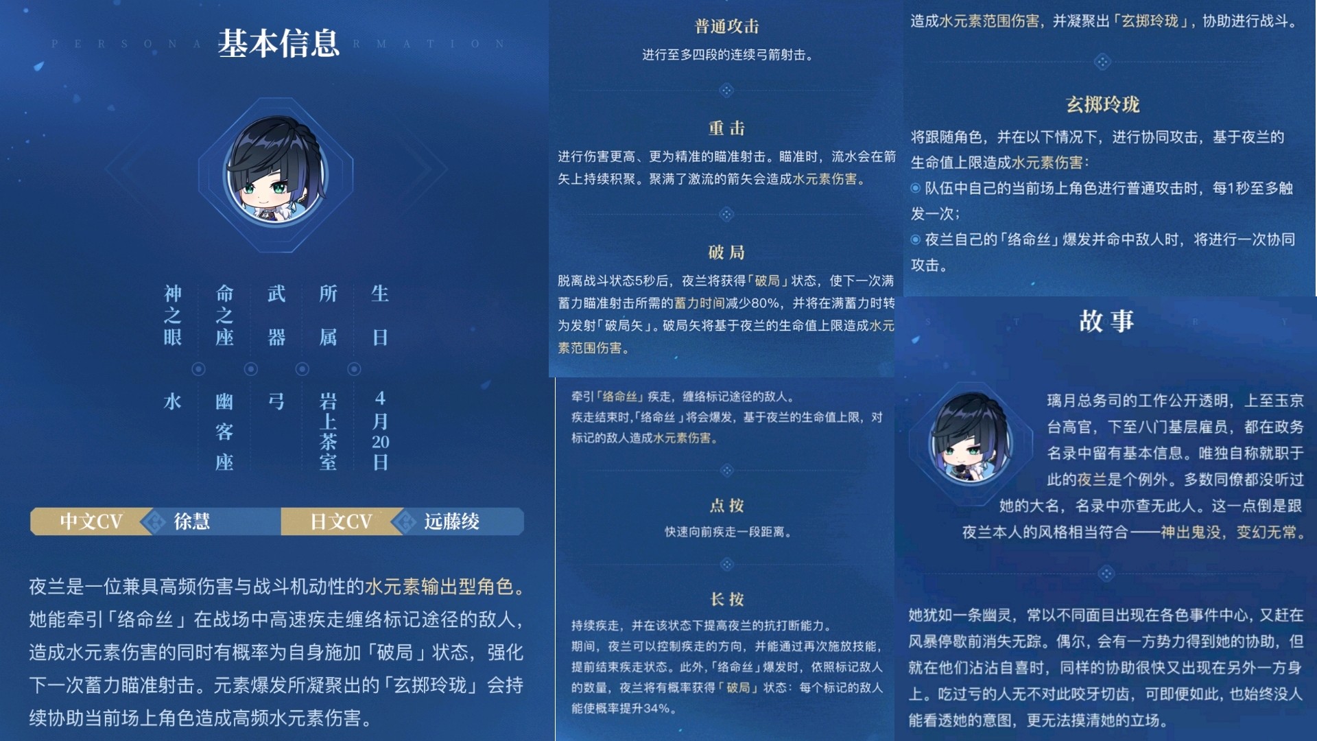 夜兰是一位兼具高频伤害与战斗机动性的水元素输出型角色。她能牵引「络命丝」在战场中高速疾走缠络标记途径的敌人,造成水元素伤害的同时有概率为自身施加「破局」状态,强化下一次蓄力瞄准射击。元素爆发所凝聚出的「玄掷玲珑」会持续协助当前场上角色造成高频水元素伤害。