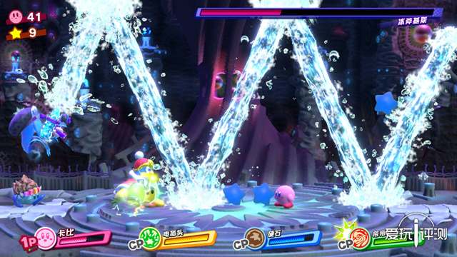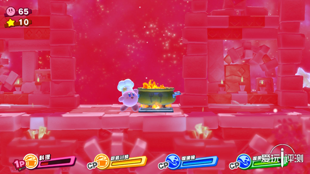 四人组队,并将变身、强化、合体三项相加的结果就是让《新星》的一周目体验变得即丰富又爽快。每一个需要特定能力解决的机关前面,也都有固定刷新的敌人作为变身或者归化的原材料,虽然可以关闭解谜提示,但是“开卷考试”般的体贴依然让玩家感到被游戏服务过度,更不用说本作CPU那超强的执行力,在谜题面前甚至只要按一下指令键他们会帮你搞定版面,也难怪有些玩家会抱怨说卡比那些丰富的能力没有用武之地。