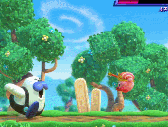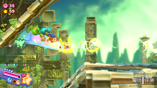 另一种就是特定场景下的四人合体,触发之后卡比一行人会像杂技演员般手脚相连组成各种形状——有能滚多远就滚多远的“无敌风火轮”、搭把手让NPC过桥的“人梯”、无视地形甚至重力一味呆呆向前冲的“托马斯小火车”(名称并非官方叫法,此处是为了方便没有玩过的玩家理解而使用),以及本作最为核心的卡比战斗机——“新星同盟”,该合体出现后游戏也将顺势进入横版无弹幕2DSTG关卡,力助卡比星耀全场,无人能挡。
