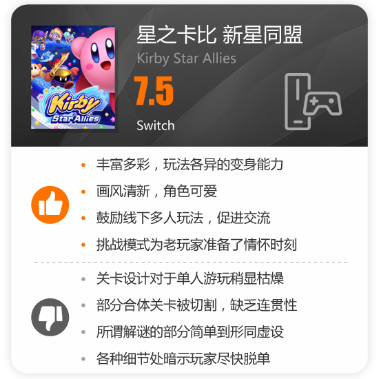 这一点也从侧面反映了HAL乃至任天堂对于《卡比》品牌的要求没有因为NS时代的到来而有所改变,也提醒因为某大作热度而入手NS的玩家,在面对这款“传统第一方独占”游戏时请务必先尝后买。