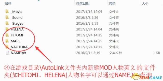3.在游戏目录AutoLink文件夹内新建MOD人物英文名的文件夹(如HITOMI、HELENA|人物名字可以通过NAME.txt查询)