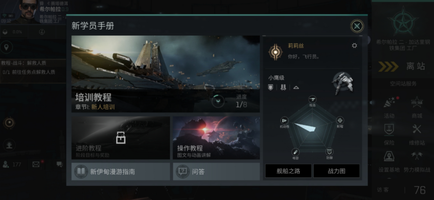 当你进入EVE手游后,你就会获得一位专属的教学指导——你甚至可以自定义它的声线,它也会表示自己“不喜欢和笨人聊天”——而这位教学指导,不仅有着近乎于手把手教你玩游戏的8个章节的基础教程,更是有着13个章节的进阶教程,同时还支持在游戏的各个界面随叫随到,几乎可以覆盖掉一名新伊甸新蛋人的所有疑问。
