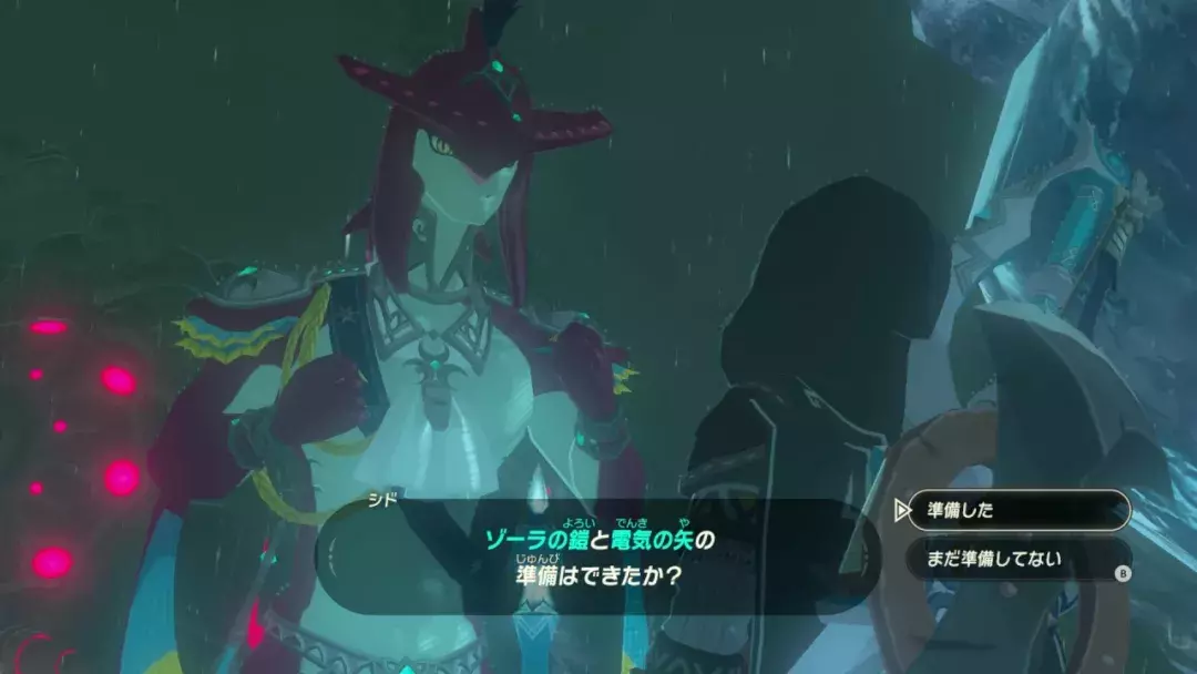 在「ゾーラ」村谈话及取得「ゾーラの铠」后,穿上后就能在村后的瀑布直游而上,我们的目标是「电気の矢」。