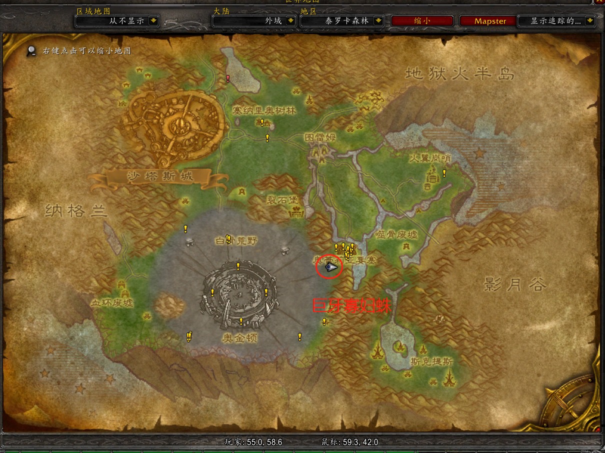 那里有很多蜘蛛,先抓一只,然后从附近的奥蕾莉亚要塞的鸟点,去刀锋山的矮人营地,下图所示圆圈位置。