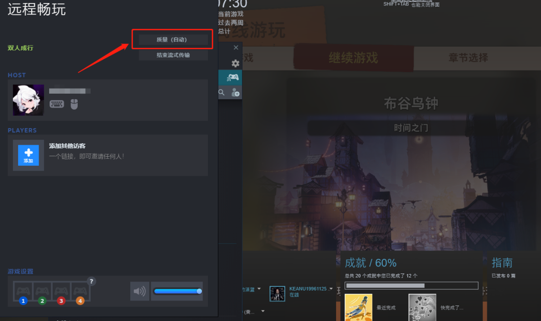 按住Shift+Tab可以看到如上图所示的画面,在红框处有码率调节选项。远程畅玩之所以被邀请的一方不需要下载游戏就是因为游戏运行的压力都在拥有者一方,拥有者的PC再通过推流的方式让好友可以在画面同步的情况下游玩。