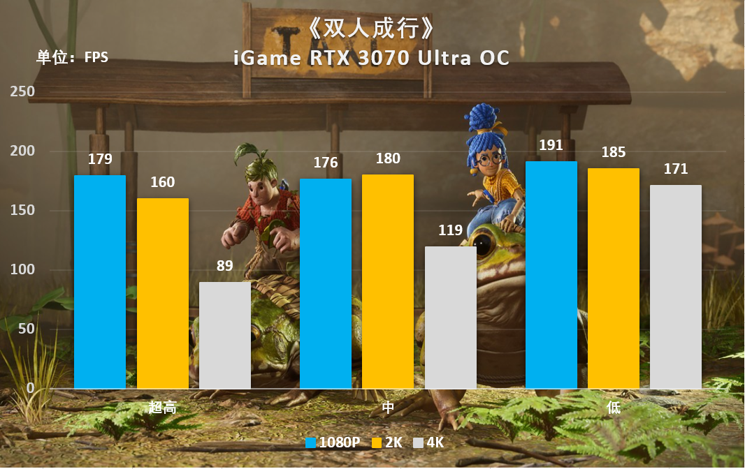 iGame RTX 3070 Ultra OC在1080P超高画质下测得平均179帧,2K超高画质下测得平均160帧,4K超高画质下测得平均89帧;在1080P超高画质、2K超高画质、4K低画质均可满足高帧率体验。