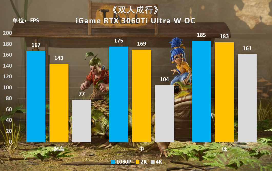 可以发现iGame RTX 3060 Ultra W OC能够满足超高画质下1080P高帧率,2K绝对稳定流畅的标准,4K分辨率也有接近60的平均帧。在《双人成行》这款一直能够受到惊喜刺激的游戏中,iGame RTX 3060 Ultra W OC势必能为玩家带来出色的体验,让玩家快乐不间断