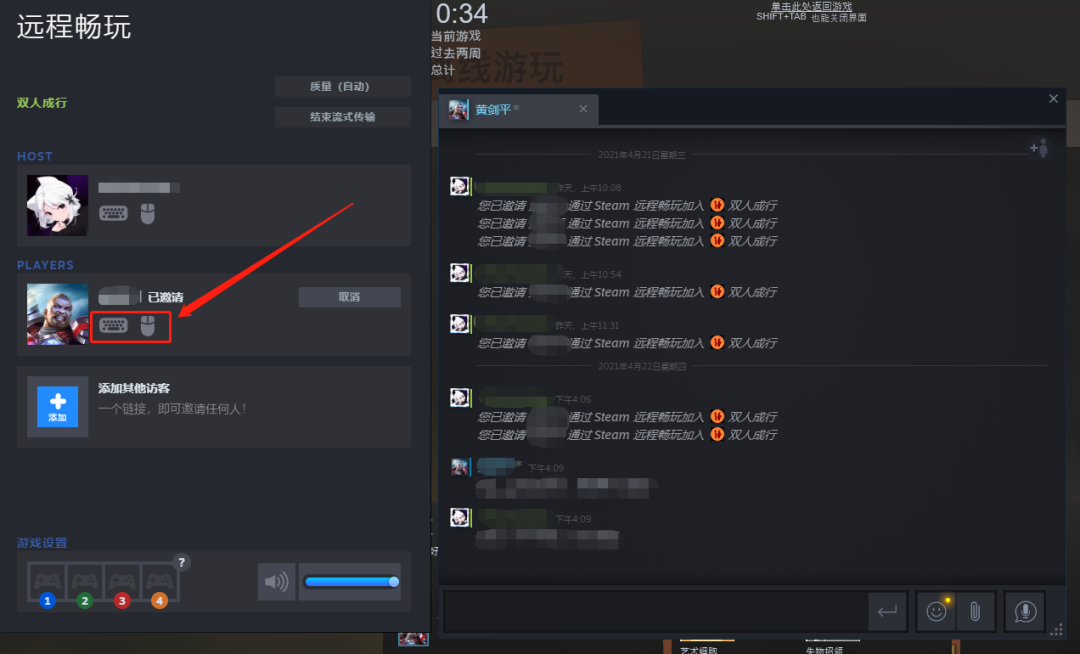 那是因为需要本体玩家激活被邀请好友的键鼠使用权。在成功邀请好友远程畅玩后如图所示,在红框处有键盘与鼠标的图标,本体玩家需点击两个图标激活,使其变为如图所示的浅灰色,如此一来,好友便能操作了。