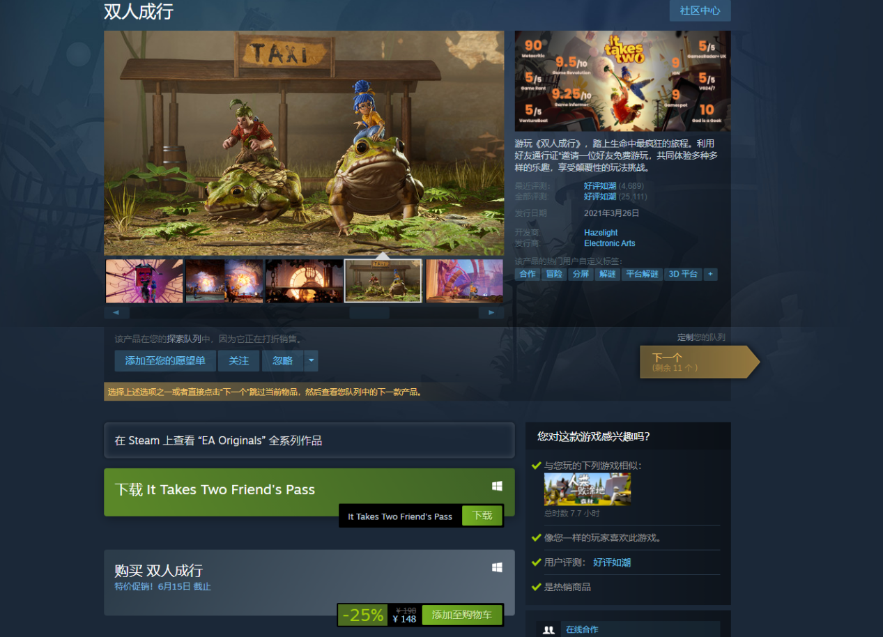 安装加速器,选择“双人成行-Origin|Steam”后一键加速,加速成功后同时加速Steam平台以及Origin平台,有效帮助各位玩家稳定流畅联机。并且目前《双人成行》在Steam商店迎来新史低特价促销,原价198元的游戏现在148元即可入手,优惠持续至6月15日,此前因为价格原因没有入手此游戏的玩家可以趁着史低价入手游戏。