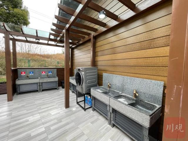 共享厨房内窗明几净,微波炉、菜刀、电磁炉等一应俱全,可满足自己做饭的“硬件”需求;洗衣区不仅配备有自动洗衣机,还有附带搓衣板的洗衣槽可供手洗,即使在9摄氏度的户外,打开水龙头不到三十秒,水就变得热气腾腾;洗衣区旁还温馨地设置了晾衣架;洗澡间内“五脏俱全”,全天24小时供应热水。“这些服务都是免费向货车司机提供。”蜀道集团成德南公司总经理王雪岭说。