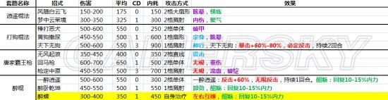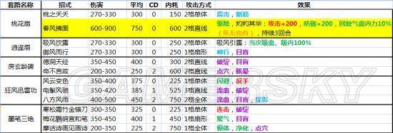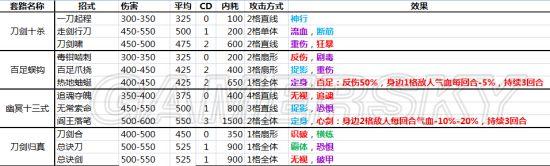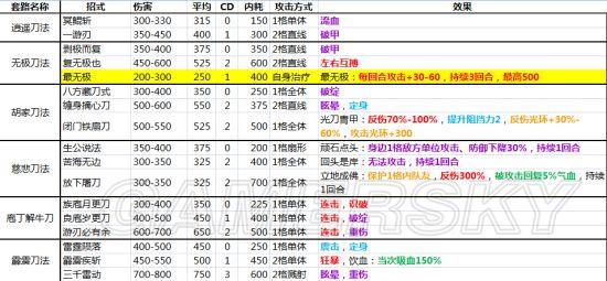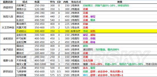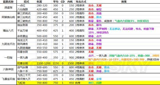 2、关于cd。原本在辟邪剑法出现以前,只有0、2、3、4几种cd,是没有1的,所以我将后面的cd数减少一回合。其实在于对1cd的理解问题,在我的表格里,隔一回合才能使用的招式就是1cd,隔2回合就是2cd。而使用一次,下回合还能使用的有两种,一种是第一招,0cd,连斩、连击后依然可以用;另一种是辟邪剑法,游戏中为1cd,我标注为0.5cd,虽然每回合都可以用,但连斩、连击后不可用。