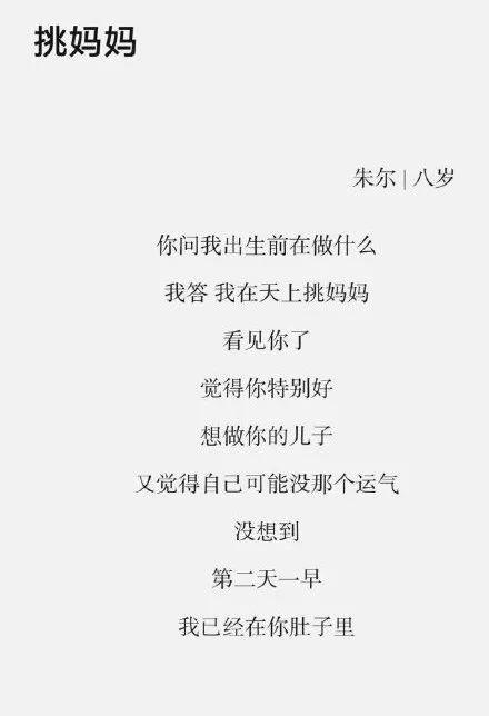 孩子在天上挑妈妈,希望有缘分做你的孩子。这首诗刷爆了朋友圈,孩子对妈妈的爱才是真正的无条件。