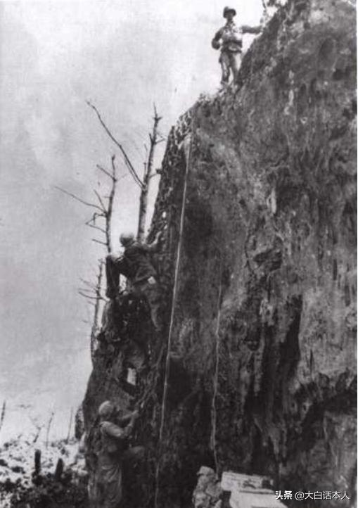 但实际情况呢,钢锯岭峭壁,真实效果长这样,来自1945年的老照片