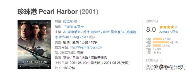 而美国人,用了几十年的时间,用了无数的战争电影,把美国大兵的形象推广到全世界,把美国人的理念,用电影的方式强行砸进观众的脑子里。就连那部从头到尾错误百出、整部电影就是在大背景下谈狗血恋情的《珍珠港》,在豆瓣上都有8.0分!为什么我们对美国的战争片如此之宽容,对中国人自已战争片,却如此之苛刻呢?