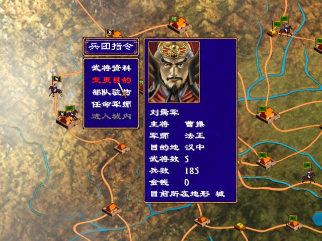 回到大地图之后,点击出征的部队,然后点击“变更目的”。速度要快,尽量在部队没走出城池范围之前变更,要不然的话返回不但穿不过去,而且还会有一场恶战,老是退兵对士气也不好嘛!