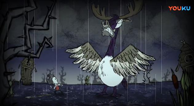 但他从没笑过。“生命不能承受的不是存在,而是作为自我的存在。”很明显,在这片没有社会的旷野,Wilson找不到可以彰显自我的缘由。他或许曾欣喜于火堆旁小高脚鸟的诞生;雪夜中,他的心或许也曾为瑟瑟发抖,簇拥在火堆旁边称他为“Friend”的猪人柔软,可前者长大后会无情地与之为敌,后者则会在月圆之夜变成怪兽:饥荒世界中,一切都只是资源和风险,战战兢兢,如履薄冰的生活永无止境。