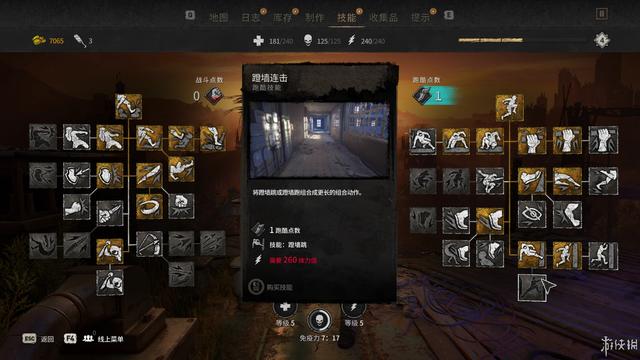 本作的角色养成内容相对来说较为繁琐,技能树方面分为战斗和跑酷两大类别,完成一定的行为动作可以增加对应类别的经验,如打架可以增加战斗经验,在屋顶上跑跑跳跳可以增加跑酷经验,升级后获得技能点可以解锁对应技能树上的各项技能。