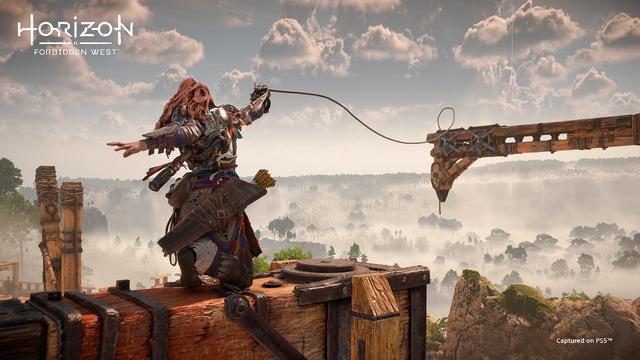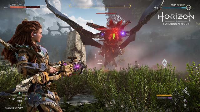 当然,敌人种类变多了变强了,主角埃洛伊也在变强,她有了更多上天入地的手段,可以操控钩爪抓取部分道具/作为自己的位移手段,还多了一个可以滑翔的盾翼,在地形起伏更明显的山地上可以更快速移动。