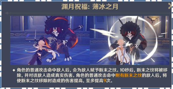 角色的普通攻击命中敌人后,会为敌人赋予断末之纹。10秒后,断末之纹将被移除,并对该敌人造成真实伤害。角色的普通攻击命中附有断末之纹的敌人后,将使断末之纹移除时造成的伤害提高,至多提高9次。