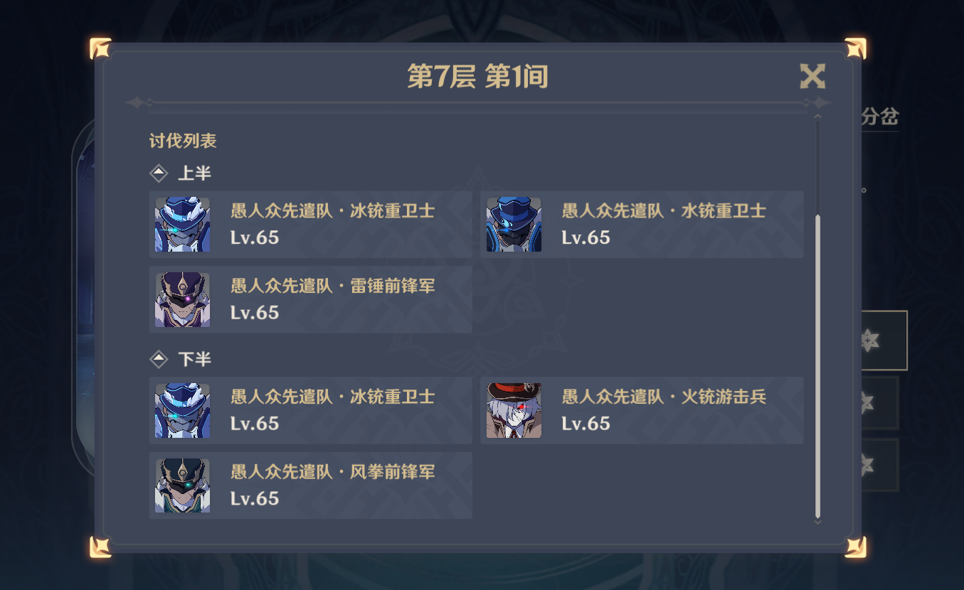 在【深境螺旋】的第七层旅行者将遭遇来自愚人众的先遣队,其成员为——冰铳重卫士、雷锤前锋军、水铳重卫士、风拳前锋军、火铳游击兵、以及岩使游击兵;每种单位自带元素特性,且具有不同的技能、以及元素护盾保护特性。