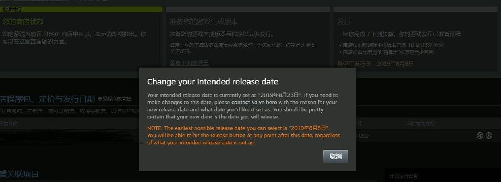 Steam于今日(8月4日)修改了开发者后台中“为作品修改预定发售时间”的规则。