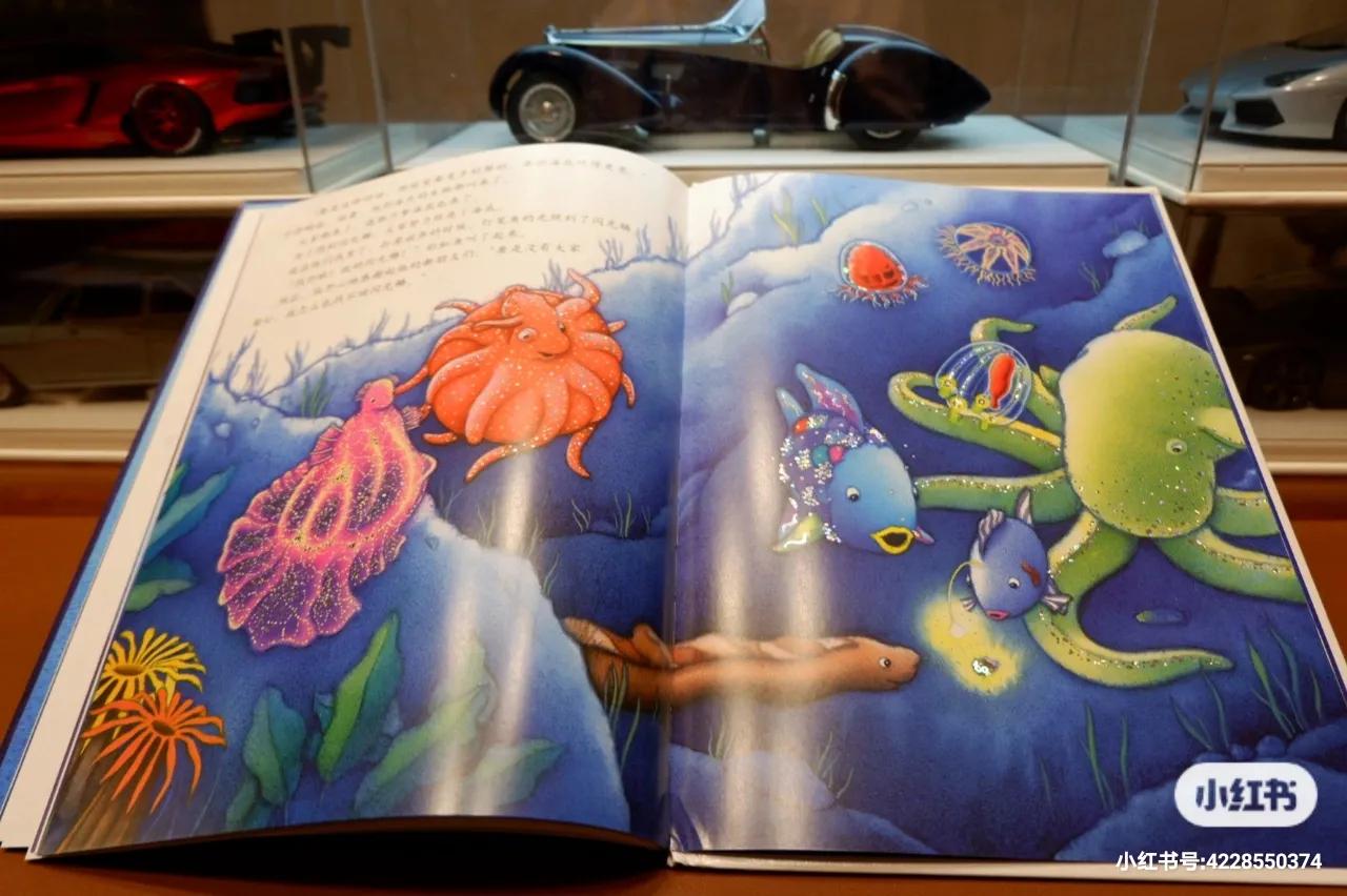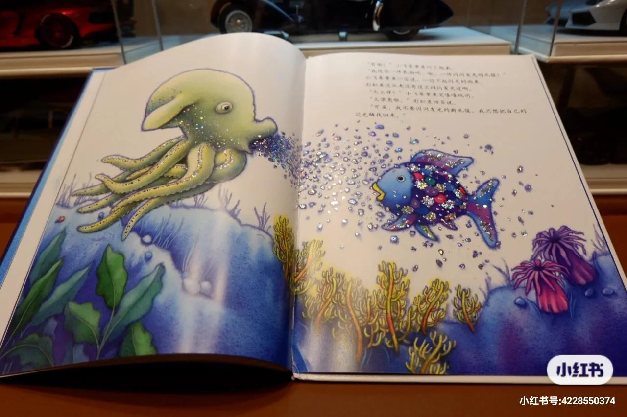 其中有一幅画特别令人印象深刻,小飞象章鱼一边说话,一边用嘴巴下起了闪光的雨。彩虹鱼全身都穿上了闪闪发光的新礼服。那一瞬间相信会是很多孩子心中的最爱,因为太漂亮了那件闪光的外衣。