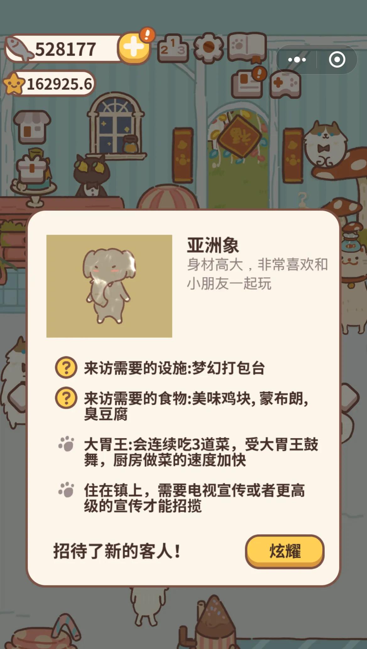 亚洲象的解锁条件是要设施梦幻打包台,食物美味鸡块,蒙布朗和臭豆腐。梦幻打包台有点小贵,大概三千多万,我一天的收入都不够哈,这几个菜品都没有什么限制,价格也不是很高,一一解锁就好啦。亚洲象对信件和花没有什么要求,比较容易解锁哒