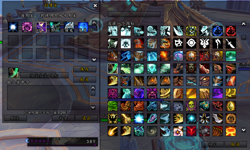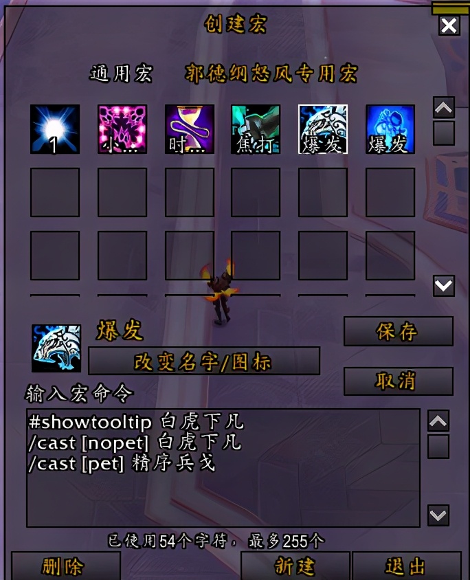 简单来说,新手玩家可以使用一个技能图标,通过使用各类代码创建出一个包含多个技能或饰品的“宏”,将一整套流程压缩成为一个“新”的技能。打个比方,如下图所示,笔者常玩格里恩踏风,就可以通过宏命令自己设置出一个名为“爆发”的宏技能(此宏中包括武僧“白虎下凡”与格里恩盟约技能的联动),当笔者想用一个技能打出两个技能的效果时,加入以下代码: