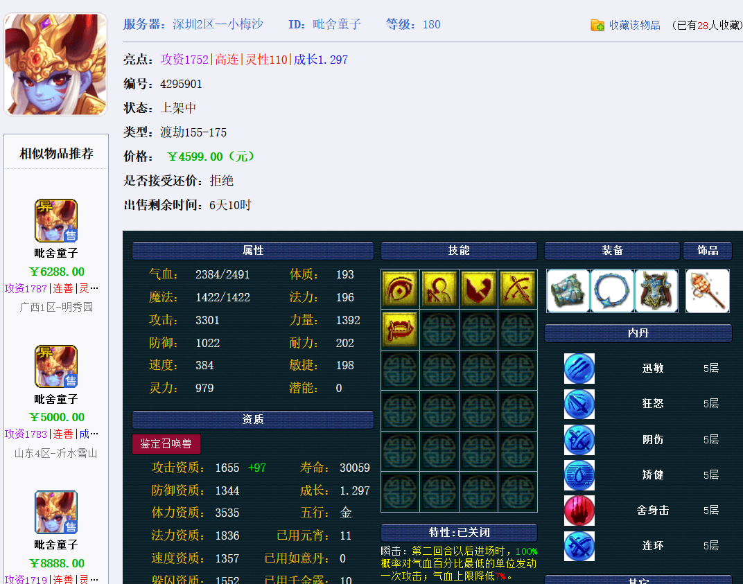 在宝宝的选择上,高级内丹刚放出来的时候生死决是天价,妥妥的一哥。许多攻宝宝都优先选择生死决,保证单回合的最大输出。舍身击经历过改动,数值调高了,坐骑的开天辟地技能也改动过。这几项结合到一块的结果就是舍身击逐渐翻身,经过这几年的变化,不少区里的舍身击价格都已经超过生死决。