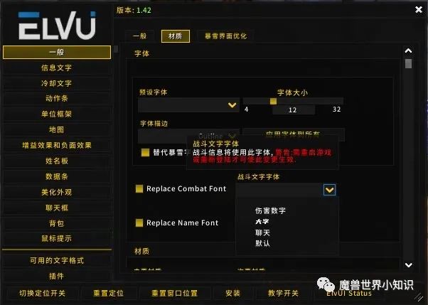 然后在游戏里,ElvUI设置-一般-材质-replace combat font 选择你的字体,重新载入界面生效/rl