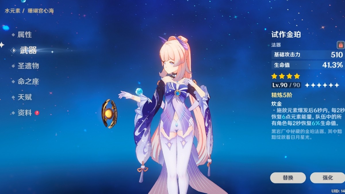 然后是关于心海的武器选择,虽然不灭月华整体来说非常完美的契合心海所需要的效果,在精炼1的情况下,大致上等同于让心海每次的平A可以多400左右的伤害,而在开Q大招的站场状态时,也能有效的替心海在每次普攻回复0.6的元素能量,缓解需要70点大招的能量压力,但老实说心海也没有到特别需要这把专武,以铁匠铺的试作金珀来说,也是提供生命值的副属性,同时满精炼的情况下开大后也会在每两秒回复6点元素能量,比满精炼的不灭月华回得还要快。