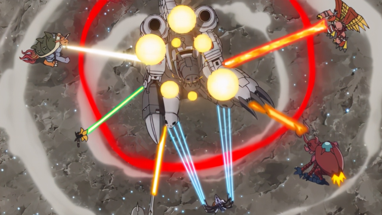 面对无比强大的无限龙兽,太一等人和数码宝贝们都陷入苦战。完全体的数码宝贝们的攻击对于无限龙兽来说,不痛不痒,反而无限龙兽的攻击随便碰到便将它们重创。