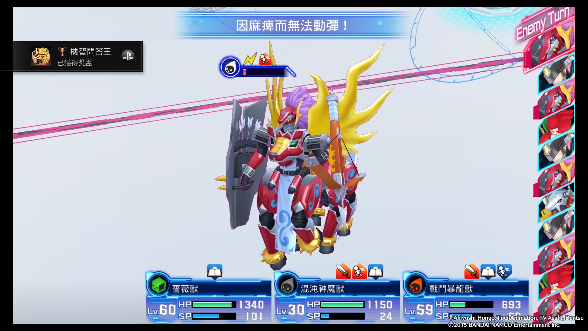 §5.接下来还要控制诺奇雅的两只数码宝贝战斗,这场战斗直接自动模式就可以。胜败都可以。生命值最低时触发剧情。接下来的战斗只要无限使用暴龙飓风剑与加鲁鲁加农炮即可。
