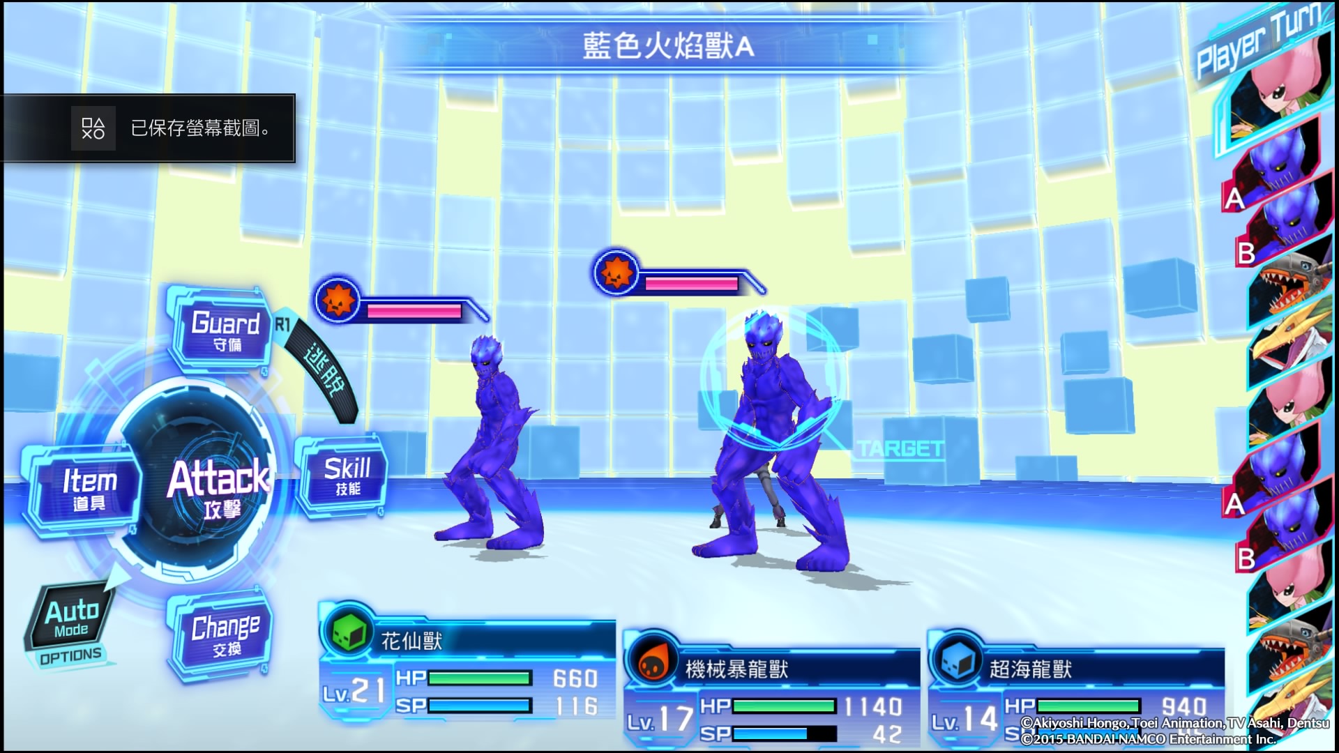 §6.在深处开启并且复制秘密文件后会进入剧情战斗,敌人是两只蓝色火焰兽,这里注意敌人会使用可以让我们的数码宝贝进入混乱状态的技能。战斗之前多装备一些抗混乱装备。在战斗结束后还要消灭一只侵蚀者。结束战斗后自动剧情结束章节。