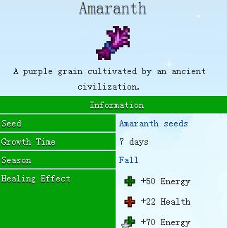 苋菜是一种源自古代文明的紫色粮食,它会在秋天从苋菜种子中长出,jojamart和种子商店都有出售它的种子,需要七天的成长时间。