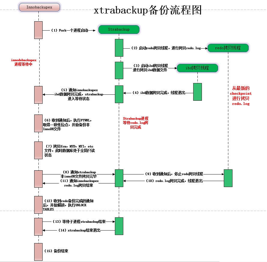 最后innobackupex和xtrabackup进程各自释放资源,写备份元数据信息等,innobackupex等xtrabackup子进程结束后退出。