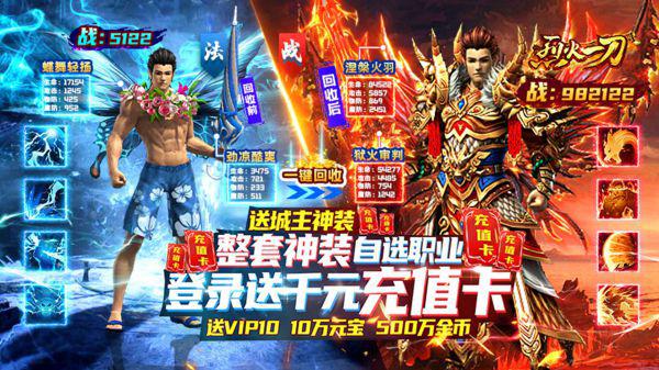 烈火一刀-送神装千充:登录即可前往邮箱领取职业自选神装一套,以及1120元充值卡,达到要求即可任性开启。充值卡可累计VIP经验,但无法计算充值活动!登录就送VIP10,元宝10w,金币500w,一套自选职业神装!还有千元充值卡大礼包,打开即得1120元充值卡,以及城主体验神装一套!首充返利大升级,最高可得十倍元宝,还有神兽麒麟,无级别神装,秘籍三分归元气,涅槃火羽等豪礼等你来拿!VIP礼包免费领取,传世神装、金色战纹、五阶官印、红色图谱,领你想要!装备回收有惊喜,次次回收有元宝!持续登录豪礼送,海量转生丹、橙色图鉴、神装碎片、元宝任君领取!超值月卡特权升级,购买不仅可领多倍元宝,更有专属BOSS、挂机加成等特权专享!