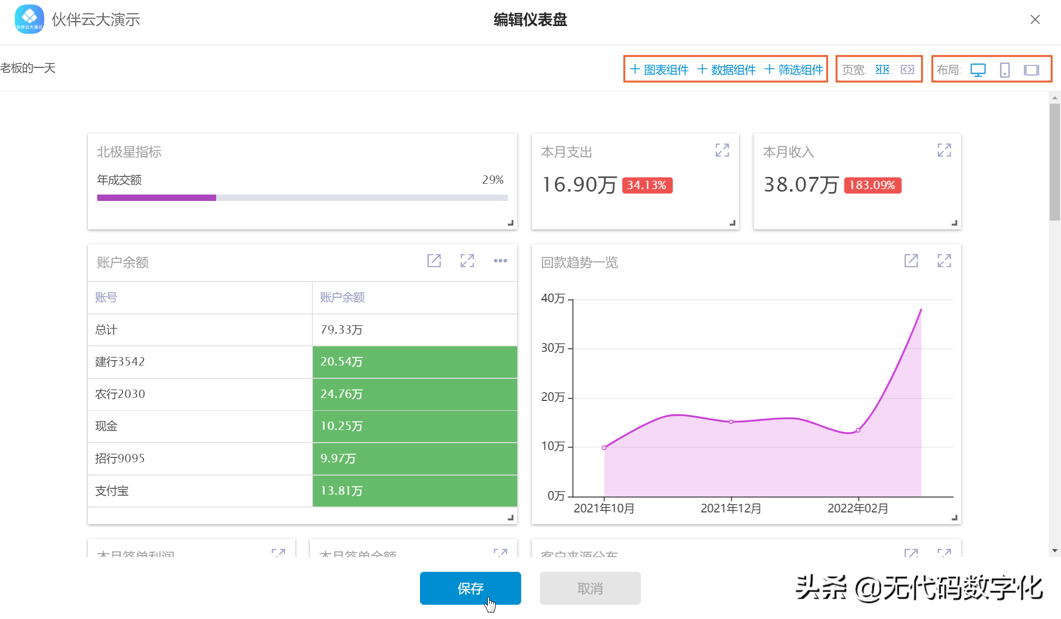 伙伴云有表格图,单值图,折线图,面积图,柱图,条图,双轴图,散点图,饼图,漏斗图,地图11种图表组件;支持自由钻取和路径钻取,支持快捷筛选和联动筛选;原始表会通过同步到分析平台,成为同步表;聚合表使用聚合操作,生成的中间表就是聚合表,聚合表是可以嵌套使用的。