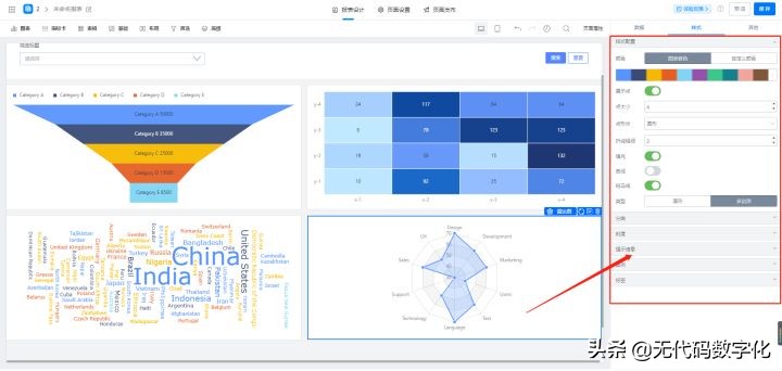 宜搭有柱状图,折线图,饼图,仪表盘,漏斗图,热力图,中国地图,柱线混合图,词云,雷达图,日历热力图,指标卡,基础表格,交叉透视图,可放入文本 ,图片,链接,布局包括选项卡,分栏,容器,支持下拉筛选和时间筛选以及字段查询;可设置查询方式为必填或者标签模式,还可设置标题是否显示,标题的提示,图标,还有位置,内容的占位提示以及整体样式的设置,是否显示链接,数据缓存,选择字段,刷新,返回数据处理,编辑代码。页面设置,可进行权限的设置,并且可对组织内成员发布,访问地址可复制链接或者直接扫描二维码。