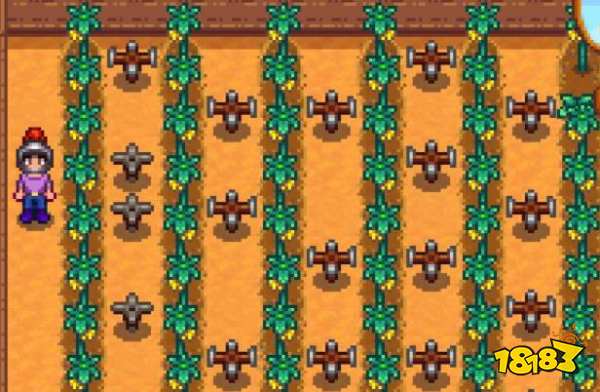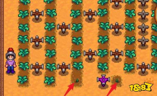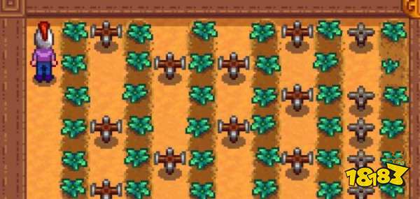 3、记住还要准备多一点高级洒水器,有规律的摆好。上面还可以种上仙人掌,那个虽然卖不到高价钱,但是可以快速补充能量。