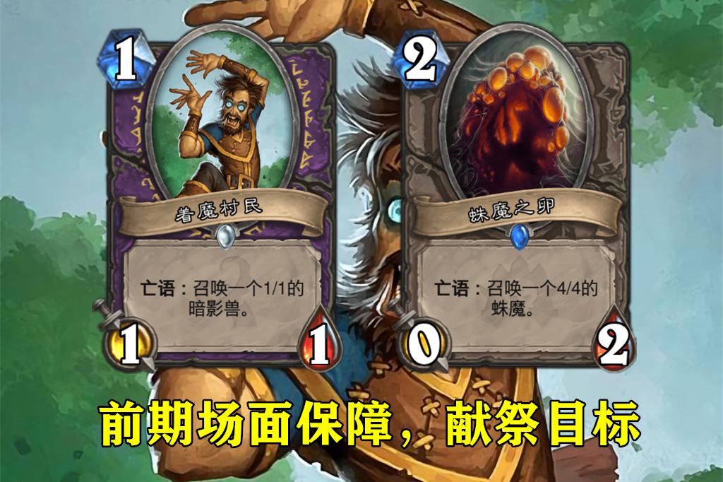 举个比较理想的例子:一费着魔村民,二费蛛魔之卵,后手三费直接就可以硬币+恶魔法阵+末日仪式,消灭蛛魔之卵,场上就是5个1-1,1个4-4和1个5-5。我个人认为,这张卡牌既能触发亡语,又能召唤强力随从,一卡两用效果强大。新版本上线后如果表现优异,大概率被削成1费,不然其它职业很难玩。