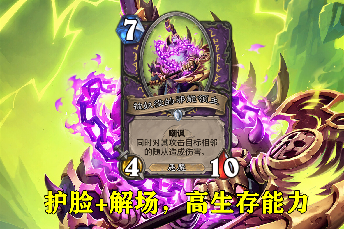 邪能领主是一张费用较高的恶魔随从,第一眼看上去会感觉它攻击力太低,身材不达标。可如果你仔细算一算,会发现它的身材恰好符合标准模型:7费后,随从身材等于费用的两倍。想想德鲁伊早期的神卡战争古树,不也只是7费5-10嘲讽吗?