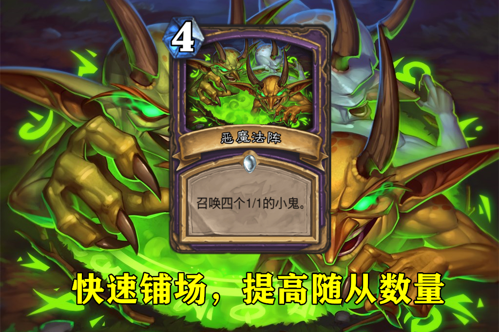 关于召唤恶魔的随从数量要求,目前还存在疑问:不知道是根据打出卡牌时的数量结算,还是根据消灭随从后的数量结算。我们以较难实现的后者来看,术士在游戏前期控制至少5个随从,难不难呢?炉石传说当前版本也许比较难,但核心系列回归了4费的法术恶魔法阵,直接可以召唤4个小鬼。不仅能快速提高随从数量,召唤出的小鬼还能当成末日仪式的目标。