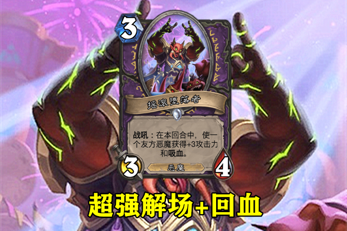 我个人非常看好这张卡牌在控制术士卡组的发挥,高血量扎实可靠,配上嘲讽效果是中后期护脸的保障。最关键的是顺劈斩效果,合理使用的话会非常强大。我第一时间想到的配合有两个:第一个是8费配合活化扫帚,直接解场。第二个是凭借高血量活到下一个回合,配合摇滚堕落者回血。一口奶回21点血,比雷诺也差不了多少。